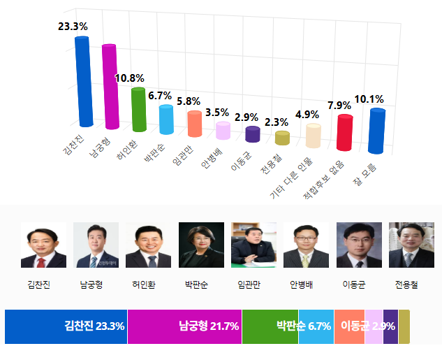 Á¦¹°Æ÷±¸Ã»Àå Èĺ¸ ÀûÇÕµµ¡¤¡¤¡¤±èÂùÁø 23.3% > ³²±ÃÇü 21.7% > ÇãÀÎȯ 10.8%