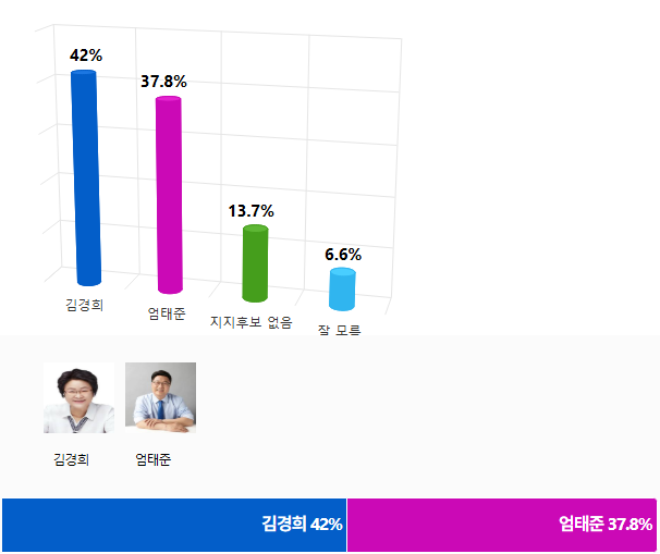À̽ÃÀå °¡»ó´ë°á : ±è°æÈñ vs ¾öÅÂÁØ¡¤¡¤¡¤±è°æÈñ 42% > ¾öÅÂÁØ 37.8%, 1-2À§ °ÝÂ÷ 4.2%p ¿ÀÂ÷¹üÀ§³» Á¢Àü