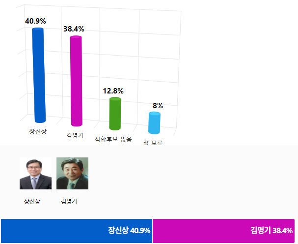 Á¦9ȸ Àü±¹µ¿½ÃÁö¹æ¼±°Å¸¦ 131ÀÏ ¾ÕµÎ°í ½Ç½ÃµÈ ¡¸È¾¼º±º¼ö ±è¸í±â vs Àå½Å»ó °¡»ó´ë°á¡¹Á¶»ç¿¡¼ 'Àå½Å»ó' È帰¡ 40.9%¸¦ ¾ò¾î 38.4%¸¦ ¾òÀº '±è¸í±â' Èĺ¸¿Í 2.5%Æ÷ÀÎÆ® Â÷ÀÌ·Î ÃÊÁ¢ÀüÀ» ¹úÀÌ´Â ¿©·ÐÁ¶»ç°¡ ³ª¿Ô´Ù.