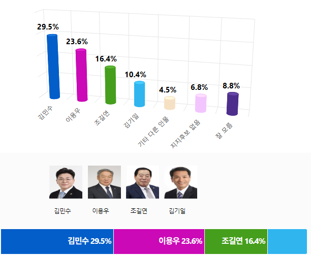 Á¶»ç±â°ü ¸®¾ó¹ÌÅͰ¡ 1¿ù 21ÀÏ¿¡¼ 22ÀϱîÁö ÀÌÆ²°£ ½Ç½ÃÇÏ¿© 29ÀÏ ¹ßÇ¥ÇÑ ¡¸ºÎ¿©±º¼ö Èĺ¸ÁöÁöµµ¡¹¸¦ ¹¯´Â Á¶»ç¿¡¼ ±è¹Î¼ö Çö Ãæ³²µµÀÇȸ ÀÇ¿øÀº 29.5%·Î 1À§¸¦, ÀÌ¿ë¿ì Àü ºÎ¿©±º¼öÀº 23.6%·Î 2À§¸¦, Á¶±æ¿¬ Çö Ãæ³²µµÀÇȸ ÀÇ¿øÀº 16.4%·Î 3À§¸¦, ±è±âÀÏ Çö ºÎ¿©±ºÀÇȸ ÀÇ¿øÀº 10.4%·Î 4À§¸¦ ÇÏ´Â °ÍÀ¸·Î ±â·ÏµÇ¾ú´Ù.