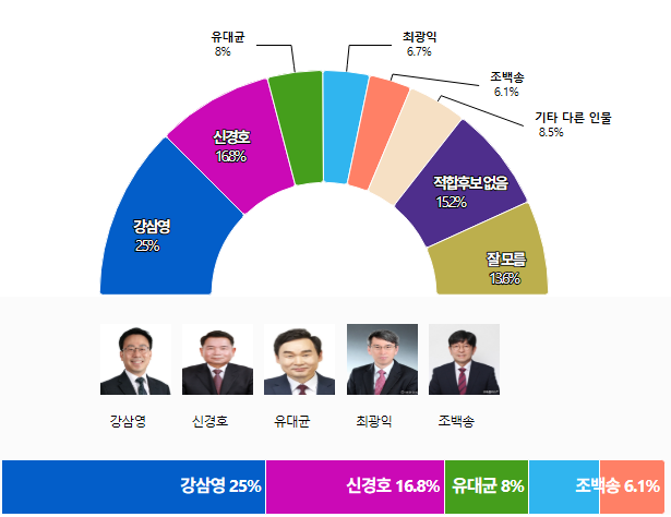 Á¶»ç±â°ü ½Ã±×³Î¾ØÆÞ½º°¡ 1¿ù 26ÀÏ¿¡¼ 27ÀϱîÁö ÀÌÆ²°£ ½Ç½ÃÇÏ¿© 29ÀÏ ¹ßÇ¥ÇÑ ¡¸°¿øµµ±³À°°¨ Èĺ¸ÀûÇÕµµ¡¹¸¦ ¹¯´Â Á¶»ç¿¡¼ ¡¸°»ï¿µ¡¹È帴 25%·Î 1À§¸¦, ¡¸½Å°æÈ£¡¹È帴 16.8%·Î 2À§¸¦, ¡¸À¯´ë±Õ¡¹È帴 8%·Î 3À§¸¦, ¡¸ÃÖ±¤ÀÍ¡¹È帴 6.7%·Î 4À§¸¦, ¡¸Á¶¹é¼Û¡¹È帴 6.1%·Î 5À§¸¦ ÇÏ´Â °ÍÀ¸·Î ±â·ÏµÇ¾ú´Ù.