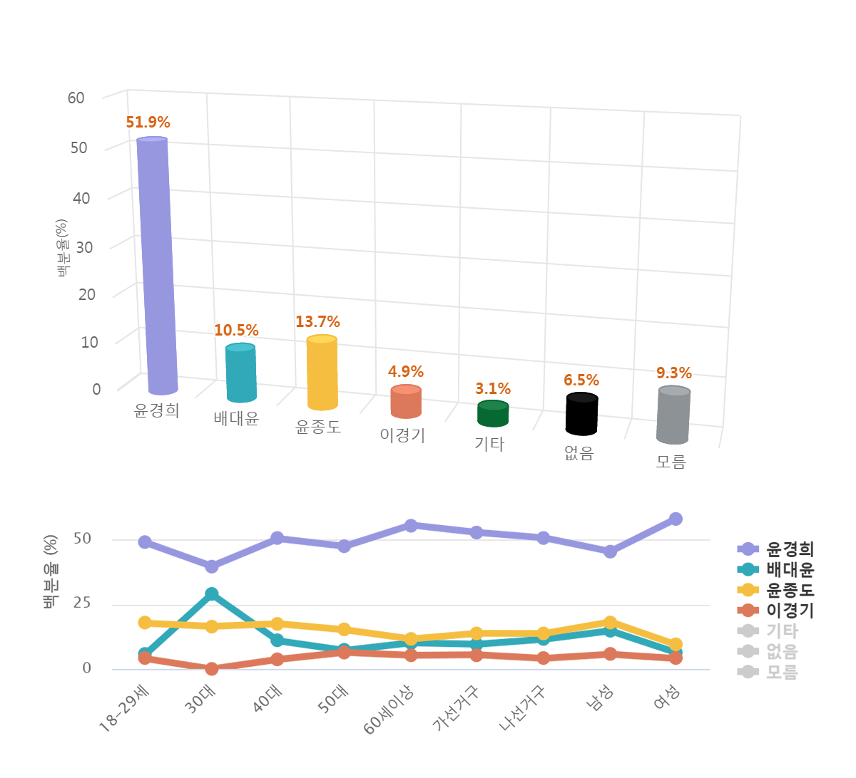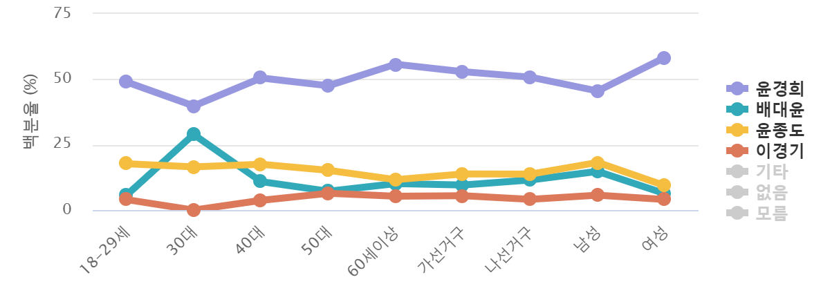 À±°æÈñ Çö û¼Û±º¼ö´Â ¿©¼º(58.3%), 60¼¼ÀÌ»ó(55.7%)°¡¼±°Å±¸(52.9%), (51.9%), ³ª¼±°Å±¸(50.8%)¼øÀ¸·Î ³ôÀº ÁöÁö¸¦ ¹ÞÀ¸¸ç, ¹è´ëÀ± Àü û¼Û±º¼ö´Â 30´ë(28.9%), ³²¼º(14.8%), ³ª¼±°Å±¸(11.5%), 40´ë(10.9%), (10.5%)¼øÀ¸·Î, À±Á¾µµ Àü °æºÏµµÀÇ¿øÀº ³²¼º(18.2%), 18-29¼¼(17.7%), 40´ë(17.5%), 30´ë(16.5%), 50´ë(15.2%)¼øÀ¸·Î , À̰æ±â Àü ûµµºÎ±º¼ö´Â 50´ë(6.4%), ³²¼º(5.7%)°¡¼±°Å±¸(5.5%), 60¼¼ÀÌ»ó(5.3%), (4.9%)¼øÀ¸·Î ÁöÁö¸¦ ¹Þ¾Ò´Ù.